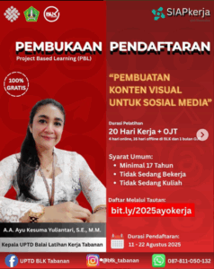 Di tahun 2025 ini, Balai Latihan Kerja (BLK) Kabupaten Tabanan selaku lembaga pelatihan kerja milik pemerintah di bawah naungan Dinas Koperasi Usaha Kecil dan Menengah dan Tenaga Kerja Kabupaten Tabanan menyelenggarakan Project Based Learning (PBL) Program Pelatihan Pembuatan Konten Visual untuk Sosial Media.